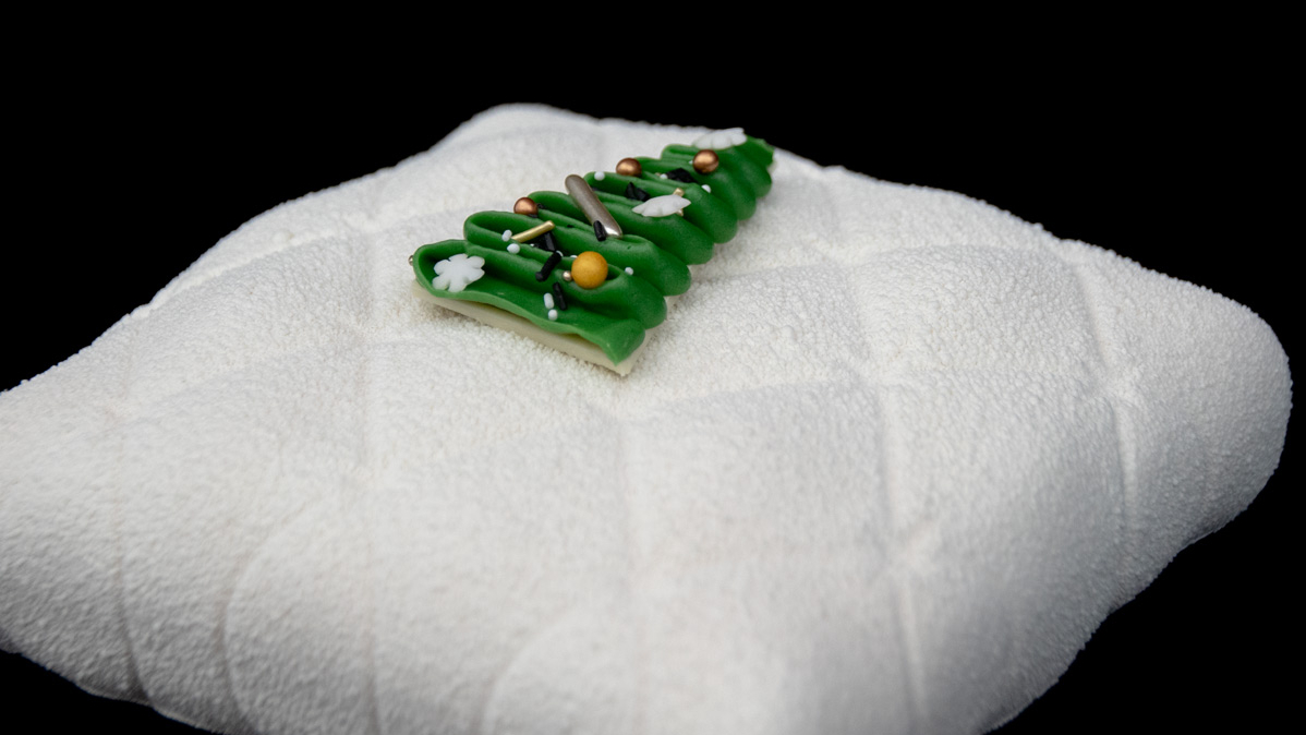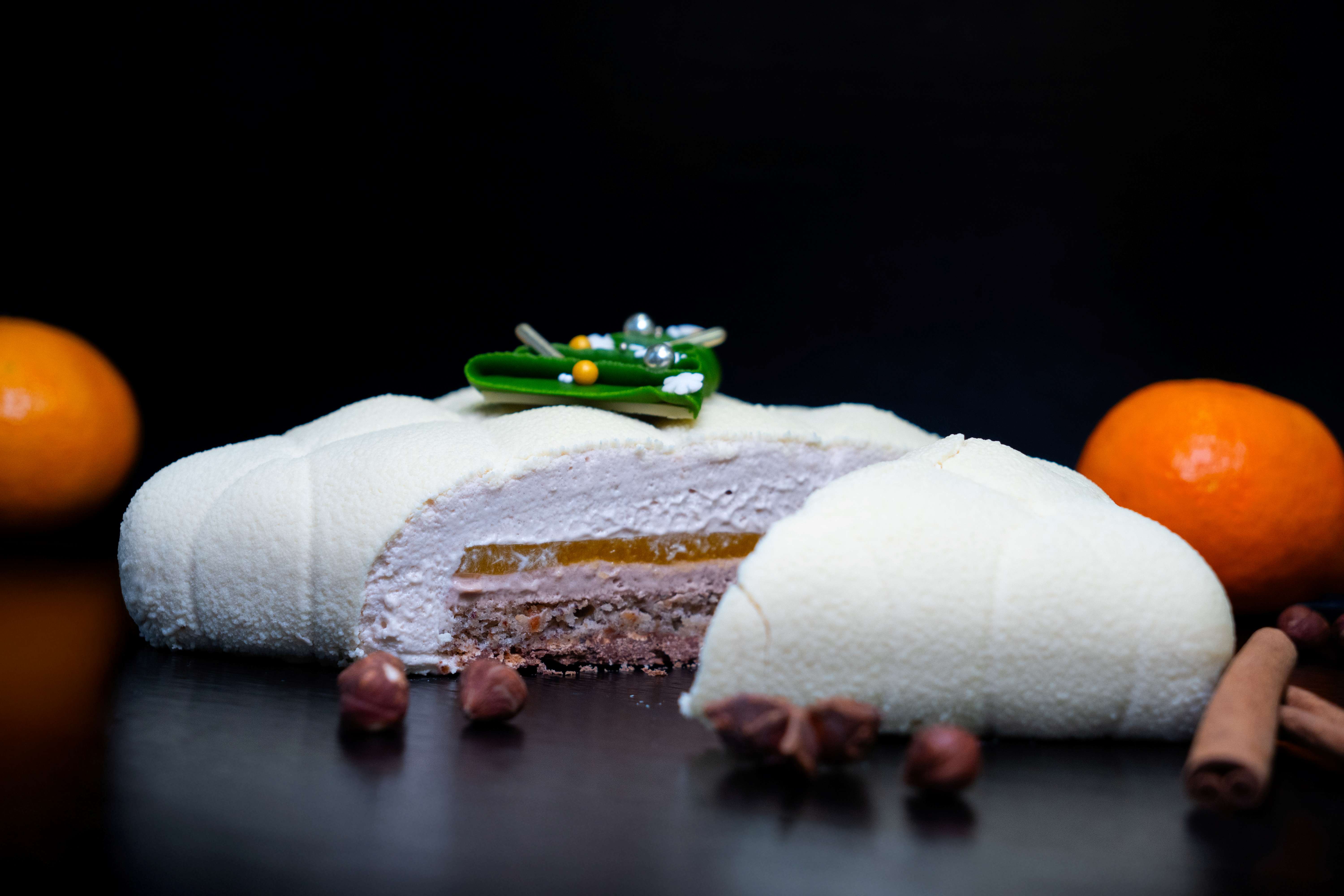 Die White Christmas Torte besteht aus einem luftigen Haselnuss-Dacquoise Boden mit weihnachtlichen Gewürzen & Crunchy Nougatschicht, Vollmilch-Schokoladenmousse, Mandarinen-Kalamansi-Kern & Marzipanmousse.